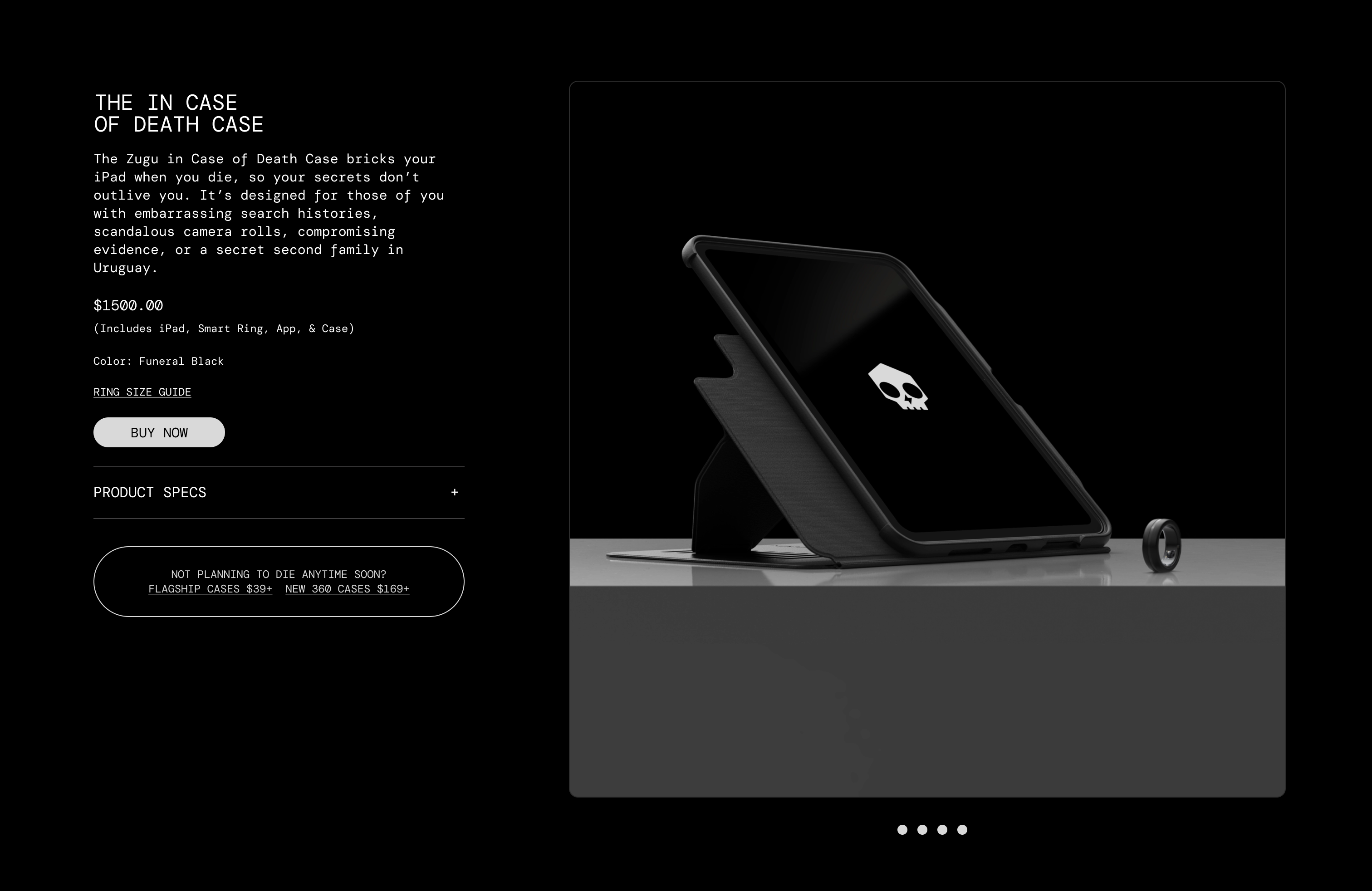 The In Case of Death Case is an innovative answer to that popular (and paranoid) question: a limited edition ZUGU iPad case, paired with a Smart Ring that monitors your heart rate, body temp, and blood oxygen, connected to an App that deletes your iPad data the moment you die. So you can take your digital secrets to the grave ;)